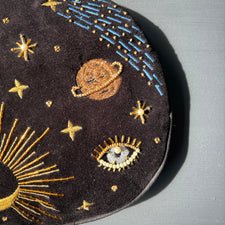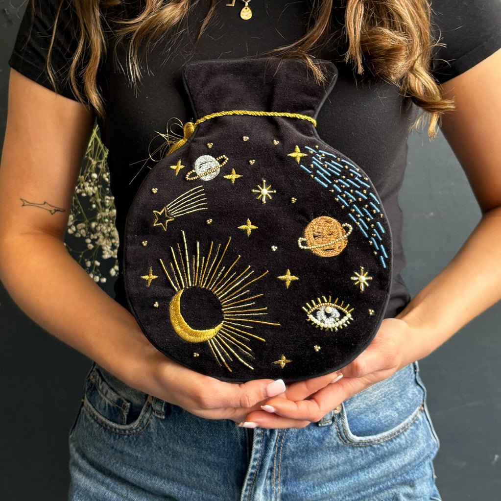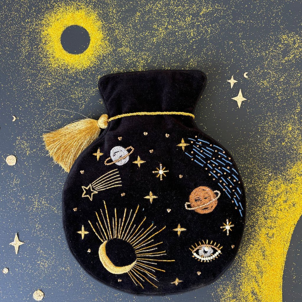 Features: Treat yourself to a touch of cosmic elegance with this gorgeous hot water bottle. Adorned with carefully beaded stars and planets, this hot water bottle is magical on aching muscles and sore tummies. Black velvet invites the dusky night sky into your home, alight with twinkling constellations and shooting stars. Set with a gold thread tassel, this hot water bottle would make a lovely gift for fans of stargazing.
