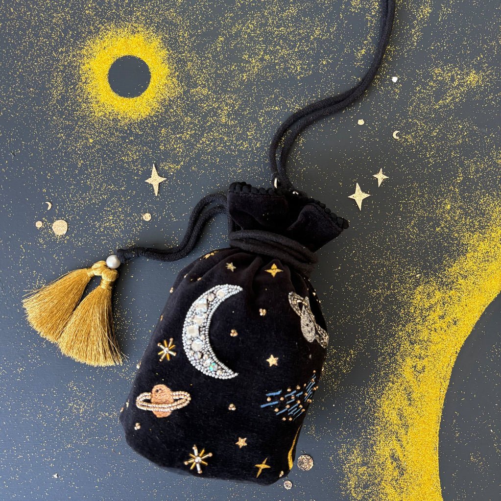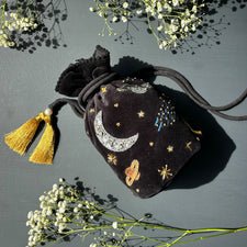 Features: Treat yourself to a touch of cosmic elegance with this gorgeous pouch. Adorned with carefully beaded stars and planets, this drawstring bag is as magical as the treasures it holds. Black velvet invites the dusky night sky into your home, alight with twinkling constellations and shooting stars. Set with gold thread tassels and pearl detail, this box would make a lovely gift for fans of stargazing.