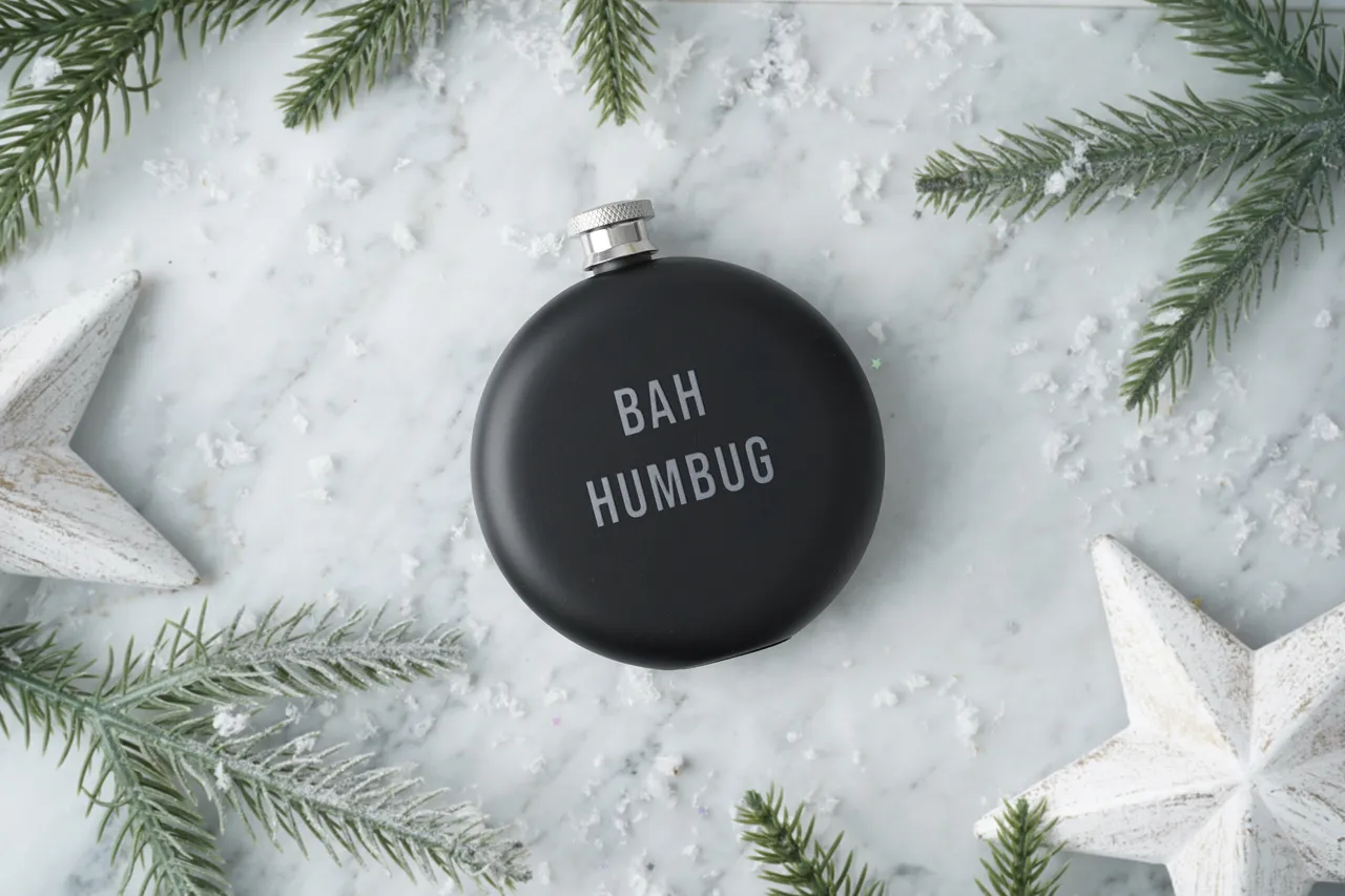 π A Quirky Gift | A small hip flask in black matt finish with the slogan ‘Bah Humbug’.