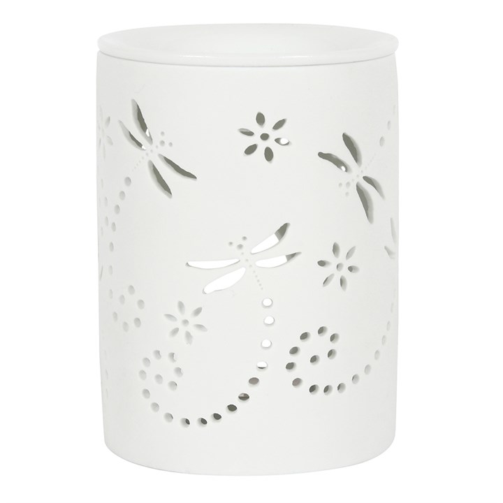 White ceramic dragonfly cutout oil burner with an unglazed finish. This item can also be used as a wax melt burner however it is advisable to consider the size and depth of the bowl when adding wax to ensure it will not overrun the edges when melted. Product Dimensions: H11.5cm x W8.5cm x D8.5cm Packaged Dimensions: H13.5cm x W10.5cm x D10.5cm