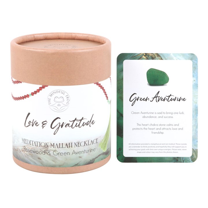 Crafted from rich, warm rosewood beads and interlaced with soothing Green Aventurine stones, this elegant necklace showcases 108 beads — a traditional number in Mallah necklaces symbolizing a spiritual journey and mindfulness — and is finished with a decorative tassel. The Green Aventurine, known for its properties of love, compassion, and gratitude, is associated with the heart chakra. It is believed to attract positive relationships, enhance empathy, and create a sense of deep emotional healing and balance in the wearer. A Mallah, or Mala, necklace is a string of beads traditionally used in meditation and prayer in various spiritual practices including Buddhism and Hinduism. Each bead represents a repetition of a mantra or prayer, aiding in focus and spiritual contemplation. To use simply hold the necklace in one hand and move from bead to bead whilst focusing on mindful breathing and repeating an intention. The necklace can be worn throughout the day as a reminder of these intentions. Each Mallah Necklace is presented in a beautifully designed box, accompanied by a corresponding information card, making it an ideal and thoughtful gift for a loved one who cherishes the values of love, compassion, and emotional healing.