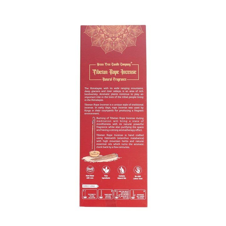 Handcrafted with mountain herbs and natural essential oils, Tibetan rope incense was traditionally used by kings to fragrance their courtyards. Now used during modern meditation practices, this unique style of incense will purify spaces while providing strong aromatherapy benefits. To use, fix the included stand to its base and hang the incense rope from the metal hook. Ignite the bottom of the rope for a few seconds, blow out, and allow to smoulder. The incense will slowly burn away, providing hours of relaxing fragrance.