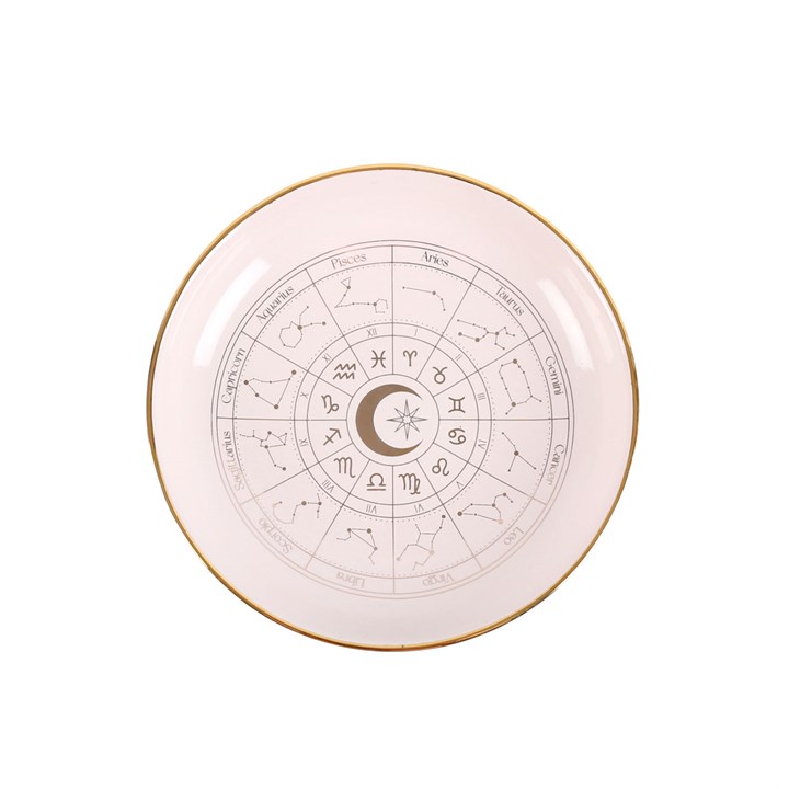 This beautiful off-white trinket dish depicts the astrology wheel in intricate, gold effect detail for a premium look. A gorgeous piece for storing treasured trinkets and jewellery, and a finishing touch for any home with celestial-inspired decor.