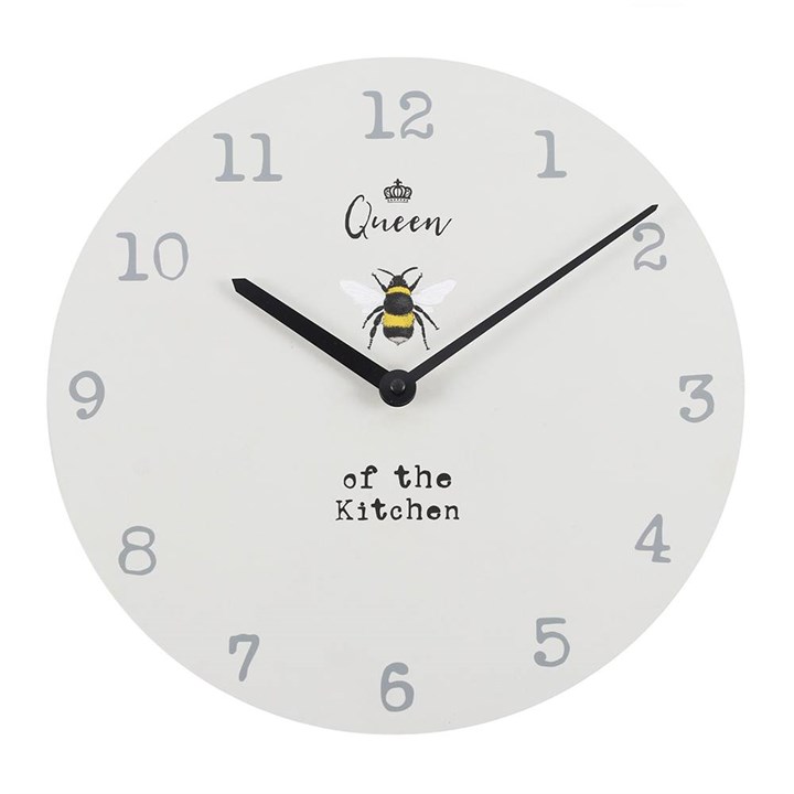 This charming wall clock features “Queen of the kitchen” text and a cheerful bee illustration. A great gift for amazing cooks. Made from MDF. 1 x AA battery required. 34cm diameter.