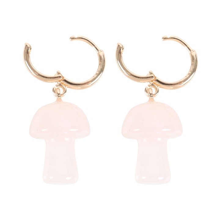 These enchanting mushroom earrings are crafted from polished rose quartz. The mushroom-shaped gemstones harness the power of crystal healing, and are attached to small gold hoop earrings with a matching informational tag. Rose Quartz is a popular stone that promotes self-love, confidence and compassion by fostering a sense of peace and harmony in the mind, body and soul. Due to its nature, stone may vary in size, shape and colour.