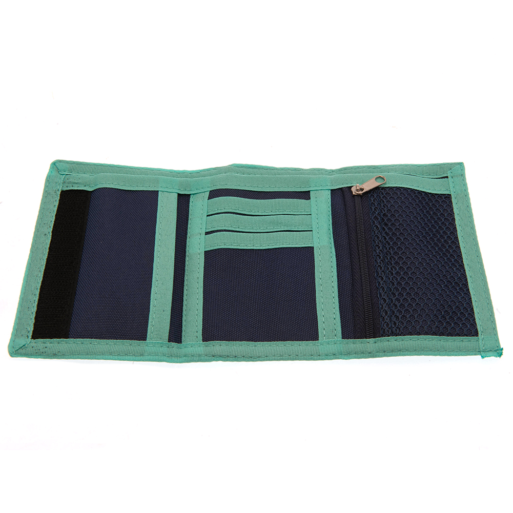 Vibrant navy wallet with aqua marine detail and abstract pattern