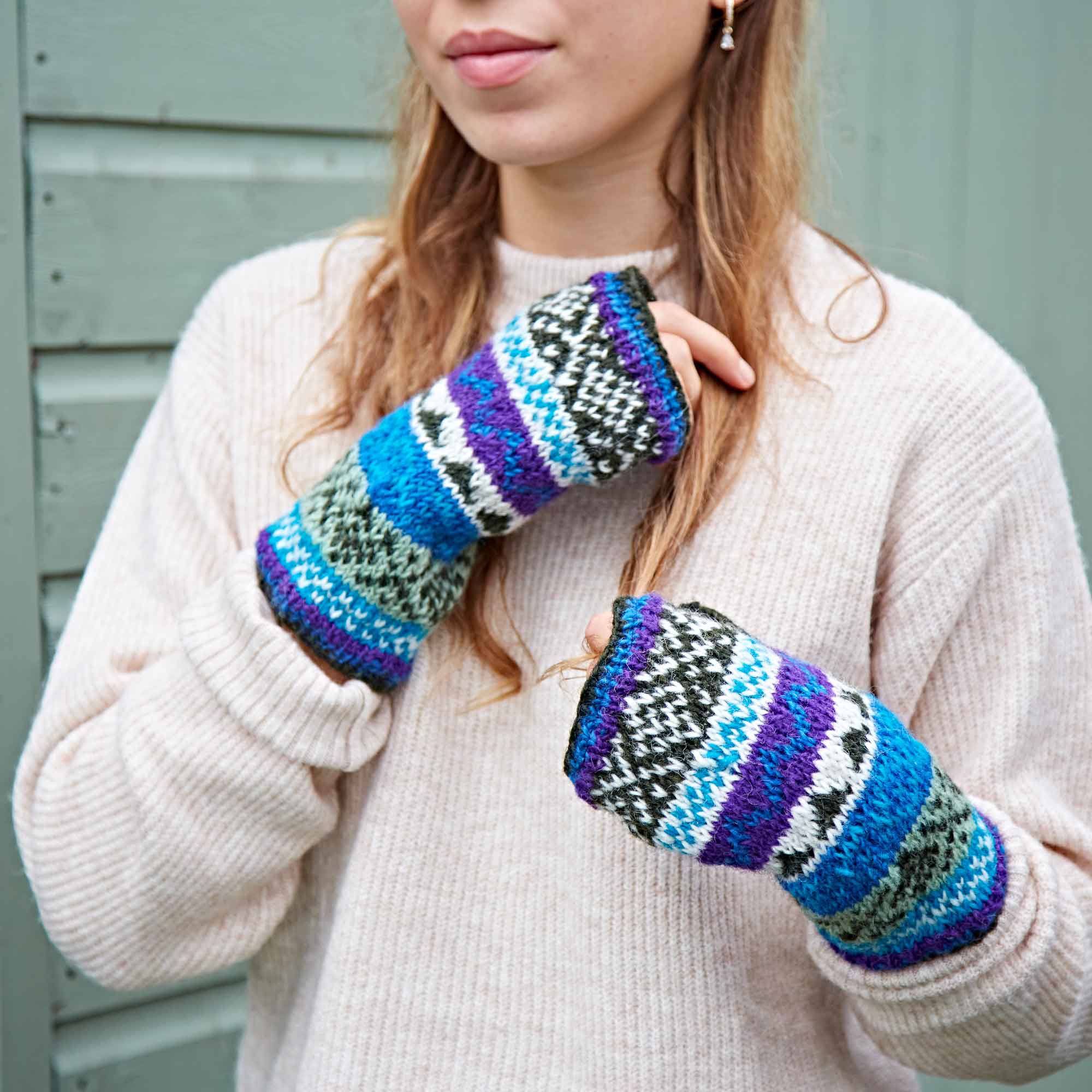 Colourful knitted fingerless gloves are lovingly handmade by Fair Trade artisans.